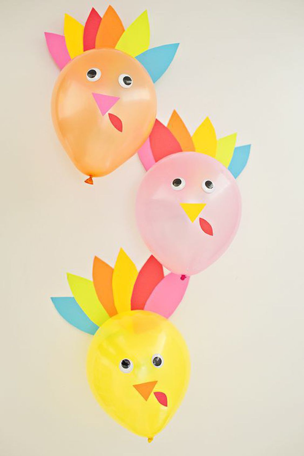 For this project, you will need a balloon, construction paper, googly eyes and glue. Cut some feather shapes of various colors from construction paper, then glue those to an inflated balloon. Add a beak and a wattle, and finish with some googly eyes.