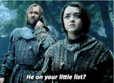 Arya has a penchant for lists, and college kids pretty much only survive off of the things. Do your laundry. Check. Write your paper. Check. Kill Walda Frey's sons and bake them into pies. Check.