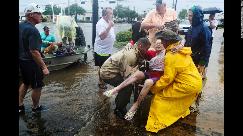 (from Long Room, posted Aug. 31st, 2017. Along with other victims, A man carries a young boy on his back as they trudge the flooded streets of Houston)