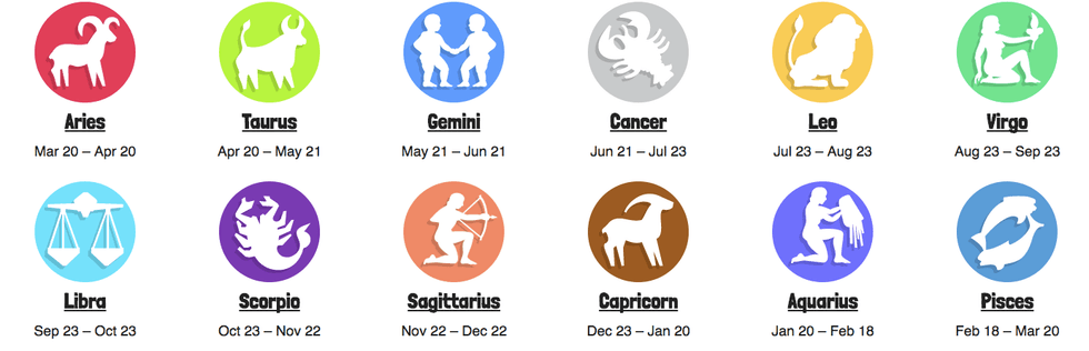 The 12 signs are Aries (3/21 - 4/20), Taurus (4/21 - 5/21), Gemini (5/22 - 6/21), Cancer (6/22 - 7/22), Leo (7/23 - 8/21), Virgo (8/22 - 9/23), Libra (9/24 - 10/23), Scorpio (10/24 - 11/22), Sagittarius (11/22 - 12/22), Capircorn (12/23 - 1/20), Aquarius (1/21 - 2/19), and Piceses (2/20 - 3/20).