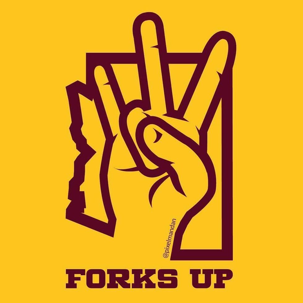 Forks Up is the traditional ASU cheer and symbol of pride. Just like USC has its peace sign styled fight on sign, ASU has its Forks Up chant. Forks up can be achieved by holding your ring finger and thumb together!