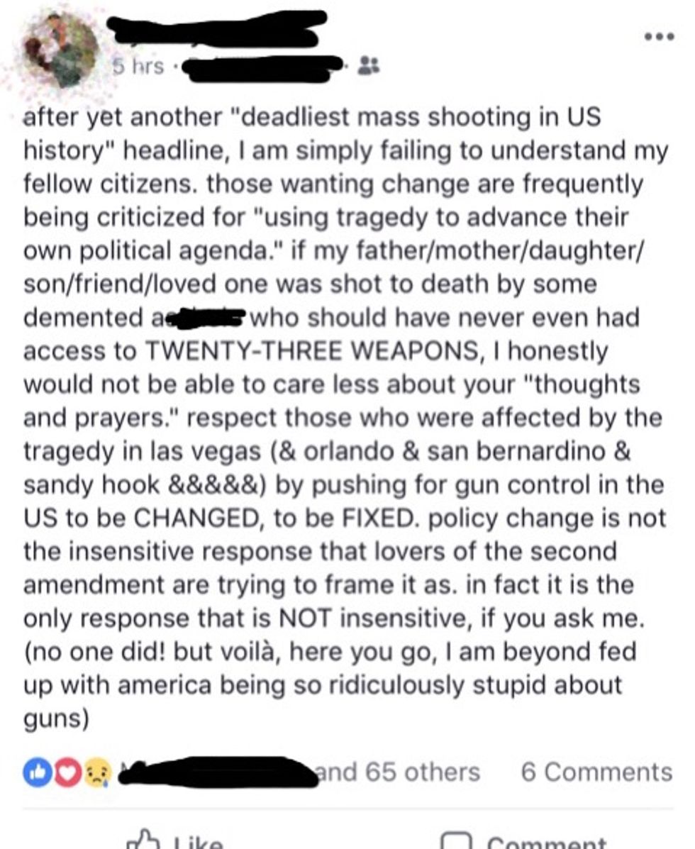 I grew up in the American South. My father owned a gun, and my grandfather owns multiple guns. However, these are not assault rifles capable of firing multiple rounds. These guns are intended for protection and have never been used for a purpose other than hunting. I may not agree with the ownership of guns, but I also understand the importance some people place in guns. I’m also not writing this article today to attack people who own guns or believe in gun rights.