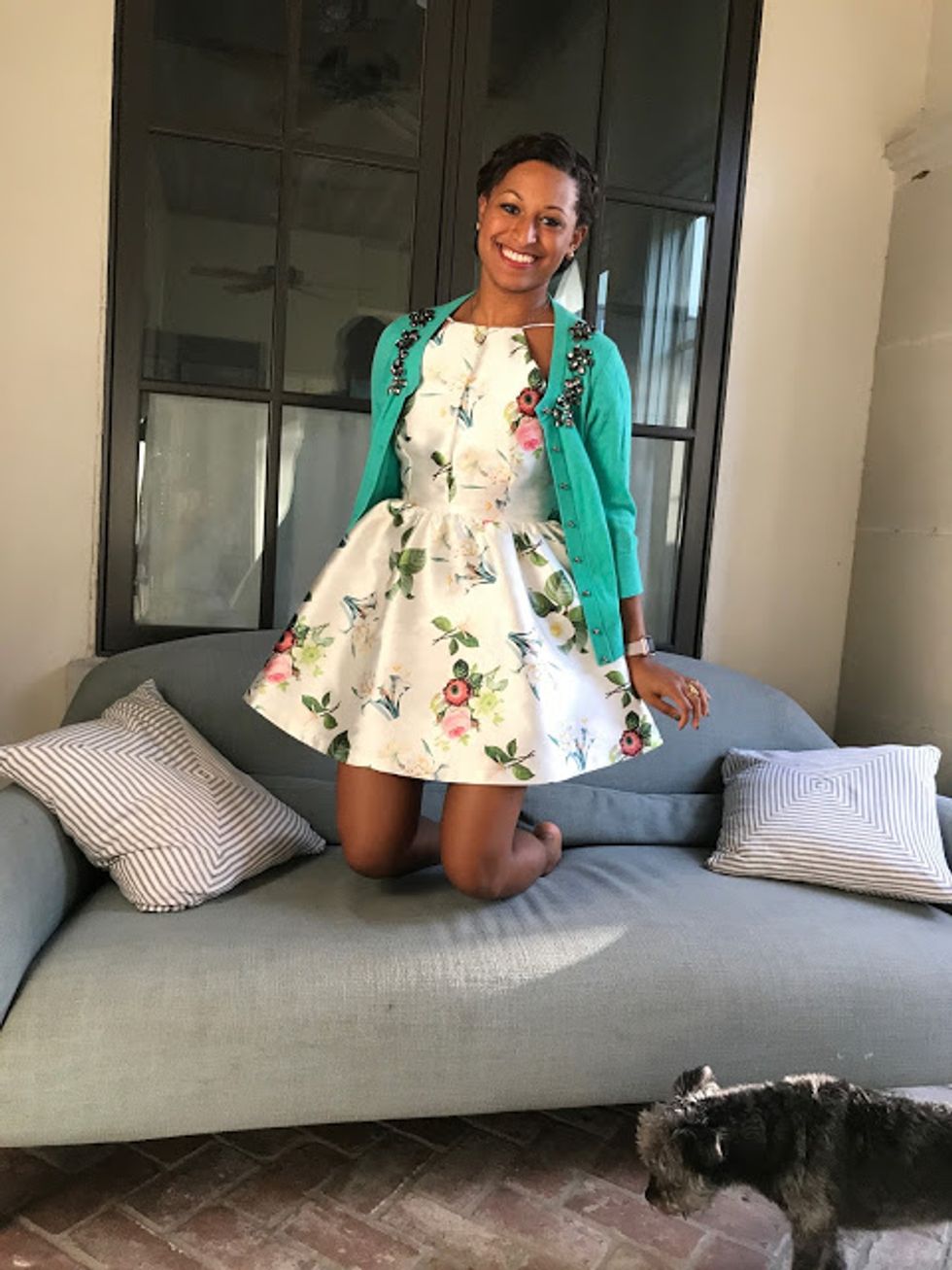 Nothing screams "Happy Friday" like this adorable dress + sweater combination! The dress is chipper and bright, and the bejeweled sweater adds sparkle. The Friday feels, along with these outfit vibes (plus a few espresso shots), had me jumping with joy that afternoon.