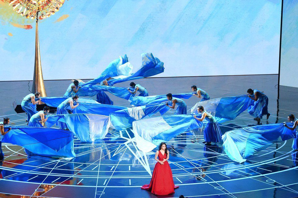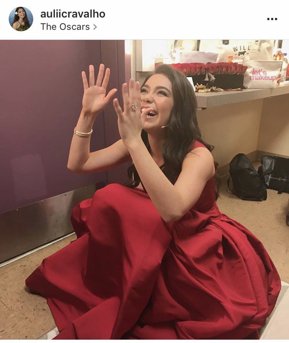 That performance is of 16-year-old Auli'i Cravalho, the voice of Moana. She performed the hit "How Far I'll Go" from the movie and it was amazing. Lin Manuel-Miranda led the performance with a rap. The young girl took it from there and blew everyone away by storm. Despite a minor bump on the head from one of the props, Auli'i was on cloud 9.