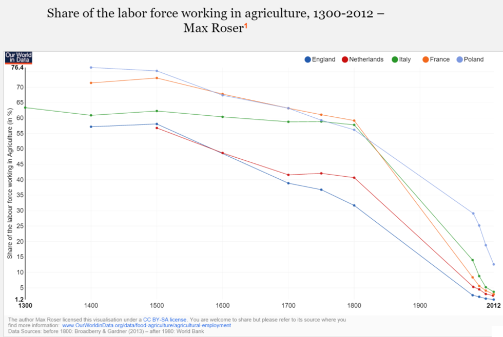 Throughout human history, the majority of humanity has had to work in agriculture in order to survive. But 200 years ago, that all changed. The ability of machines to do the work of many humans freed these people from their work, allowing them to pursue other occupations. Now the percentage of humanity working in agriculture has dropped to less than 7 percent in most developed countries.