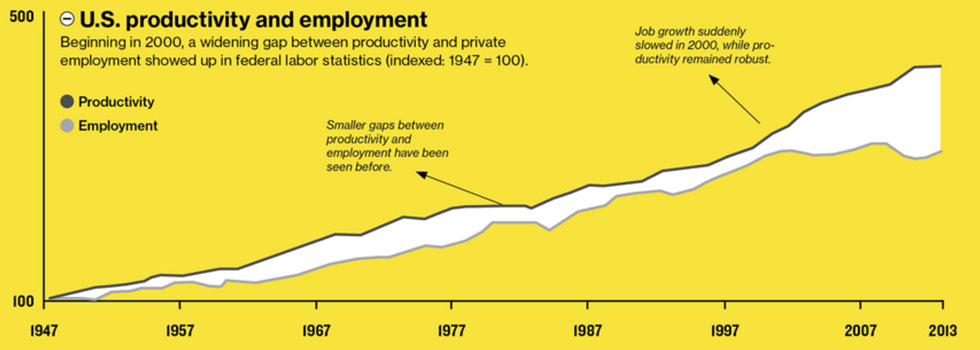 The relationship between new technology and new jobs has changed fundamentally in the past couple of decades. In their article "It's a Man vs. Machine Recovery," Bloomberg Business explained that "the classic relationship between rising output and rising employment—known as Okun’s Law—now appears to be broken. If the law, which postulates that every 3 percent gain in output should reduce the jobless rate by a percentage point, still applied, then today’s nearly nine percent rate would be about one percent."