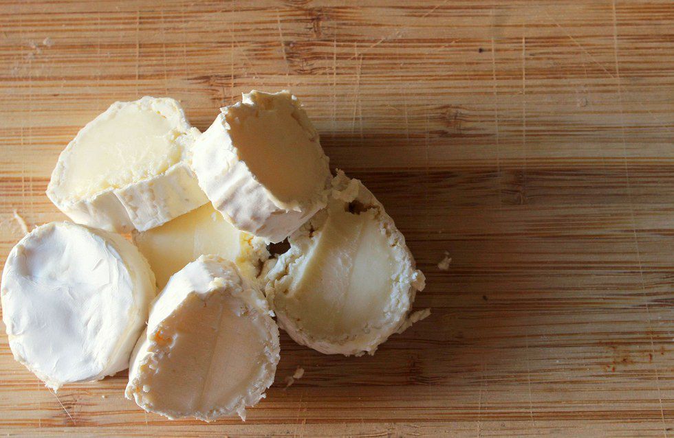 2. Wet your hands, then take a slice of brie cheese and press flat.