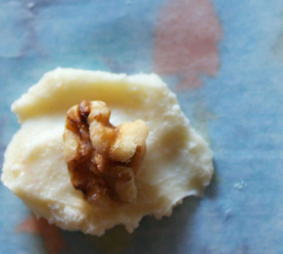 3. Grab a walnut, break it in half or quarter (depending on how big the cheese slice is) and place on the flattened cheese.