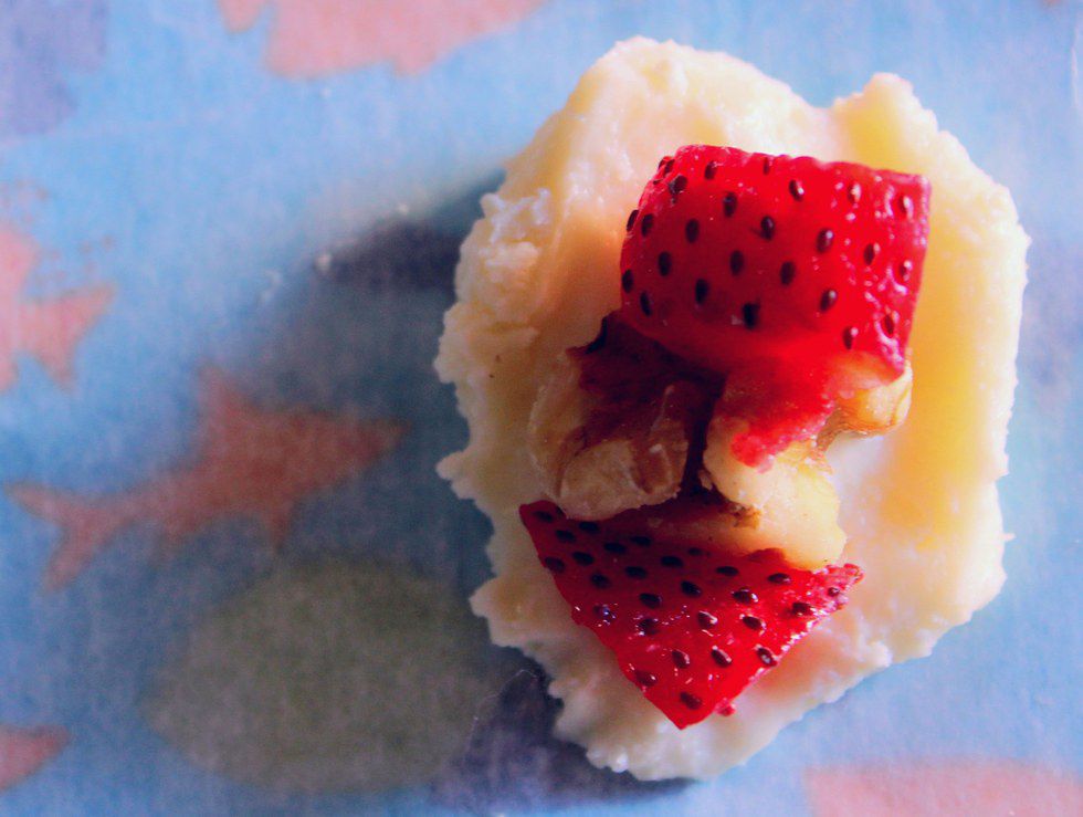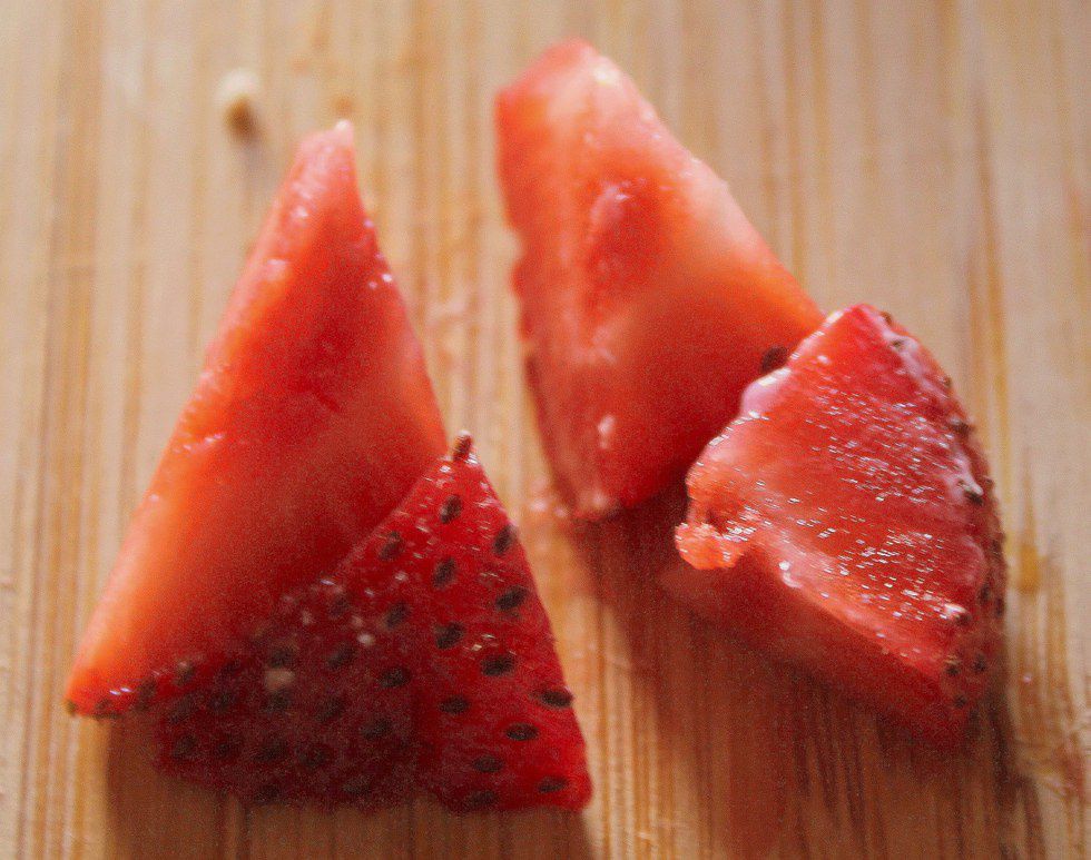 5. Place the strawberries next to the walnut (make sure the pieces are small enough to roll in the ball and slice smaller if necessary).