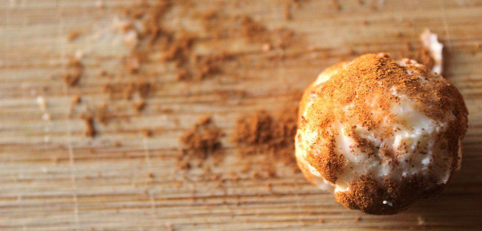 7. Spread cinnamon on top of a cutting board, then roll the ball until lightly covered with the spice.