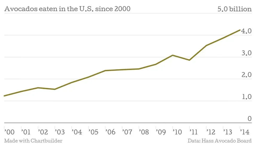 Sales of Hass avocados, the leading producer of avocados in the U.S., increased from around 1 billion to over 4 billion avocados between 2000 to 2014. The combination of the California avocado and Mexican avocados seemed to be working out fine until drought struck SoCal.