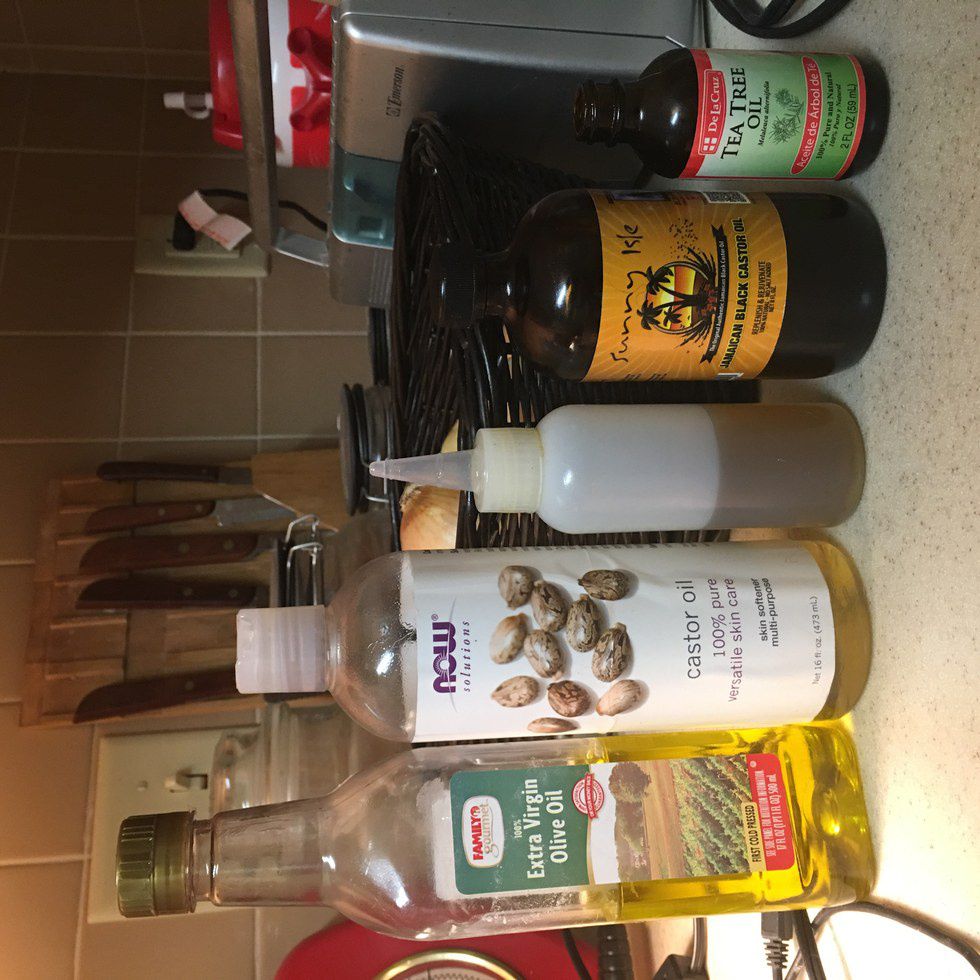 The best way to oil the hair is to use a bottle that allows oil to come out by squeezing. Then mix any oils together. Each time the concoction can be different. In the bottle, there is a mixture of Jamaican Black Castor Oil, regular castor Oil, Olive Oil (from the pantry of course) and a splash of Tea Tree Oil. Another tip is to make sure to put only put a small amount of any essential oil, which includes peppermint, tea tree and lavender oils. Oils like these are very strong, so less always goes a long way.