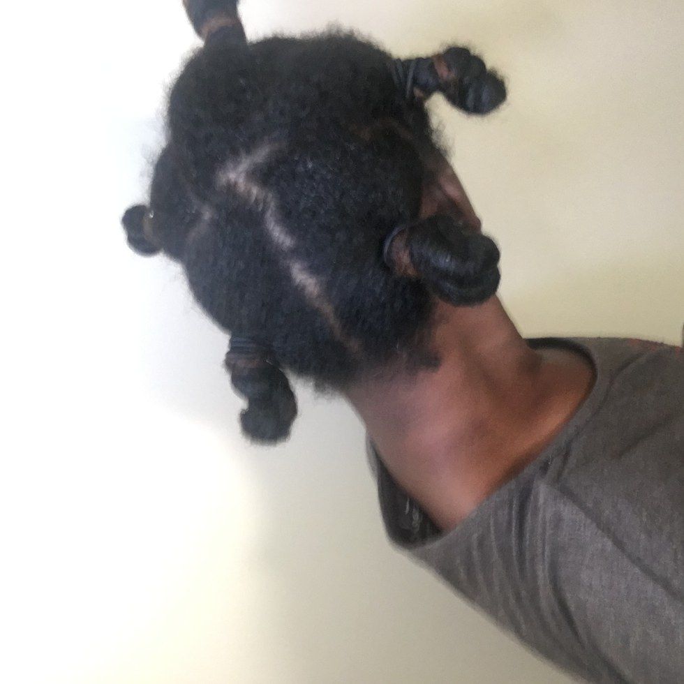 Now that all the sections are cleaned, detangled, and twisted root to end, starting in the back of the hair, take each twist and wrap it around (like a Bantu knot). Use the pony tail holders; wrap them around each twisted Bantu knot to make sure that they’re secure. Guess what? It’s finally over! It takes longer doing each step by section, but it’s the best way to retain hair length. Being patient with natural hair is a must in order to maintain health.