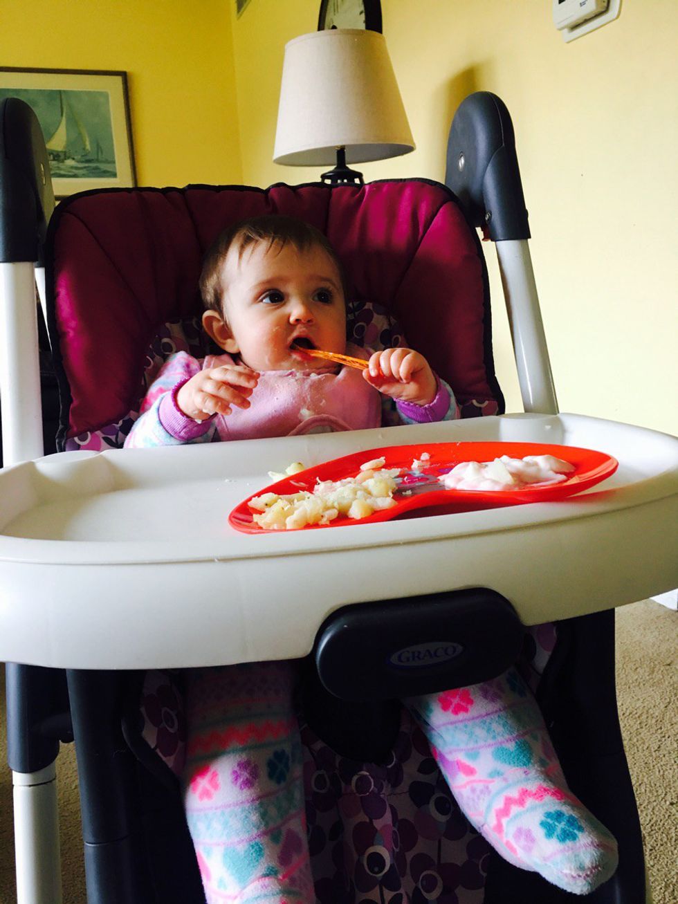 We started with breakfast on a heart shaped plate while watching Valentine's Day cartoons. Adrie had mashed up baked potatoes and organic yogurt! She loved getting to eat in front of the TV! A special holiday treat!