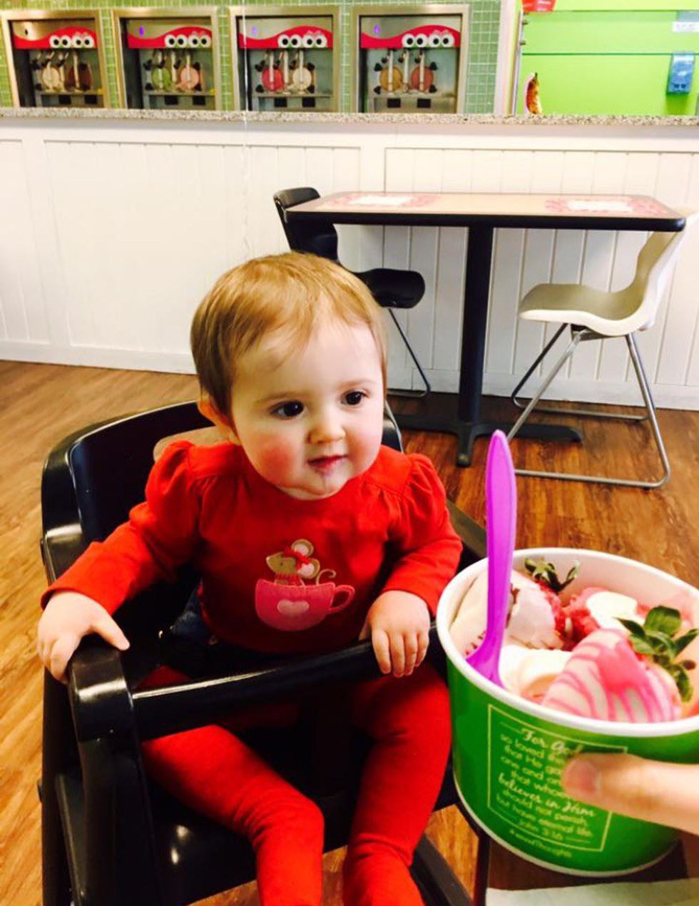 Adrie got to try frozen yogurt for the very first time. Yogurt has probiotics and mama is very happy to give it to her baby because it tastes good and has tons of nutrients. Adrie liked it but was very confused as to why it was colder than her regular yogurt. Needless to say, she is a fan of sweet frog.