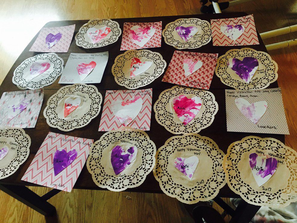 Alright so how to make Valentine's with a baby is a question I pondered for awhile, how do I make a lot fast? I can't just give her stickers and heart shaped paper and say go for it (she'd eat the stickers) so I got Crayola Kids Washable Paint and put little dollops on pieces of paper and let her go crazy (this is messy, but cleans well.)