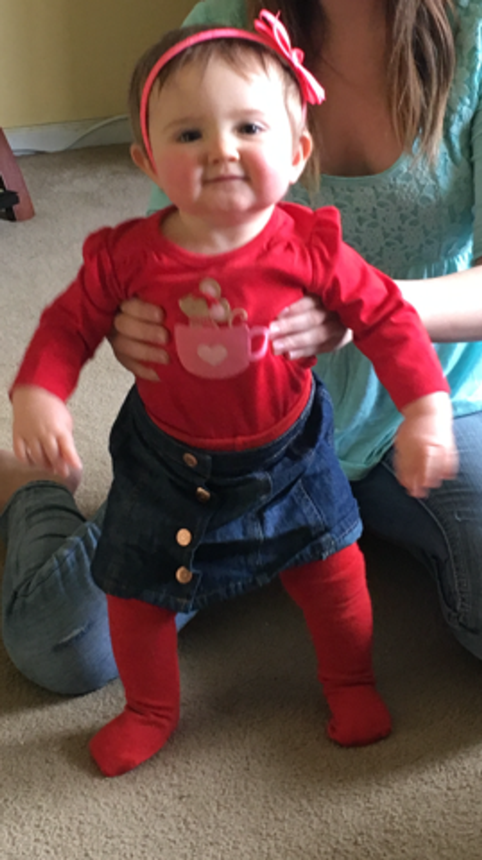 Adrie wore a red onesie of a mouse sitting in a cup with a heart on it, matching red tights, and a blue jean skirt with a pink headband that matched the color of the mouses cup.