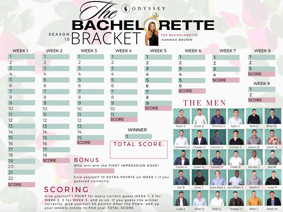 Grab your girls (and guys!) and start a competition of your own with our printable "The Bachelorette" bracket. All you have to do is print it out and fill in your predictions before the season starts. Then, after you watch each week, add up your points according to our scoring guidelines.