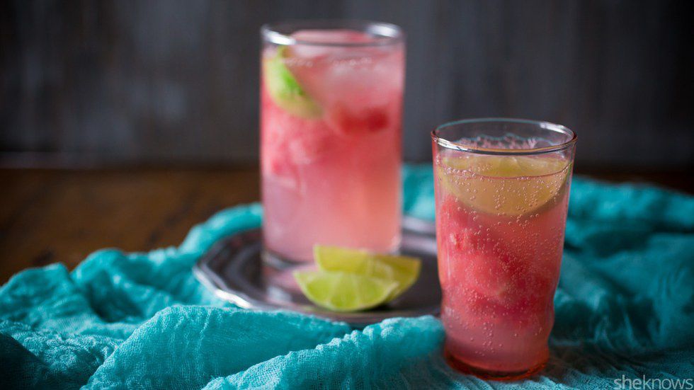 In a blender, mix 1 small watermelon cut into cubes, 1 bottle of white wine, and 1 liter of seltzer water. This easy drink is sure to cool you down with a garnish of lime slices added to finish.