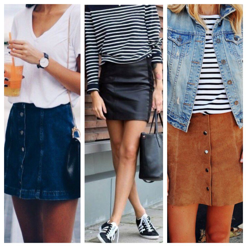 Mini Skirts have come into style in three forms: the jean mini skirt, the leather mini skirt and the suede mini skirt. Pair the jean skirt with a tucked in graphic tee and sneakers or a white basic t-shirt and sneakers. Pair the leather skirt with a basic tee and a over sized jacket and sneakers or a button down with a pair of pumps. Pair the suede skirt with a striped shirt and flats or sneakers or pair with a tucked in sweater and knee high boots or booties.