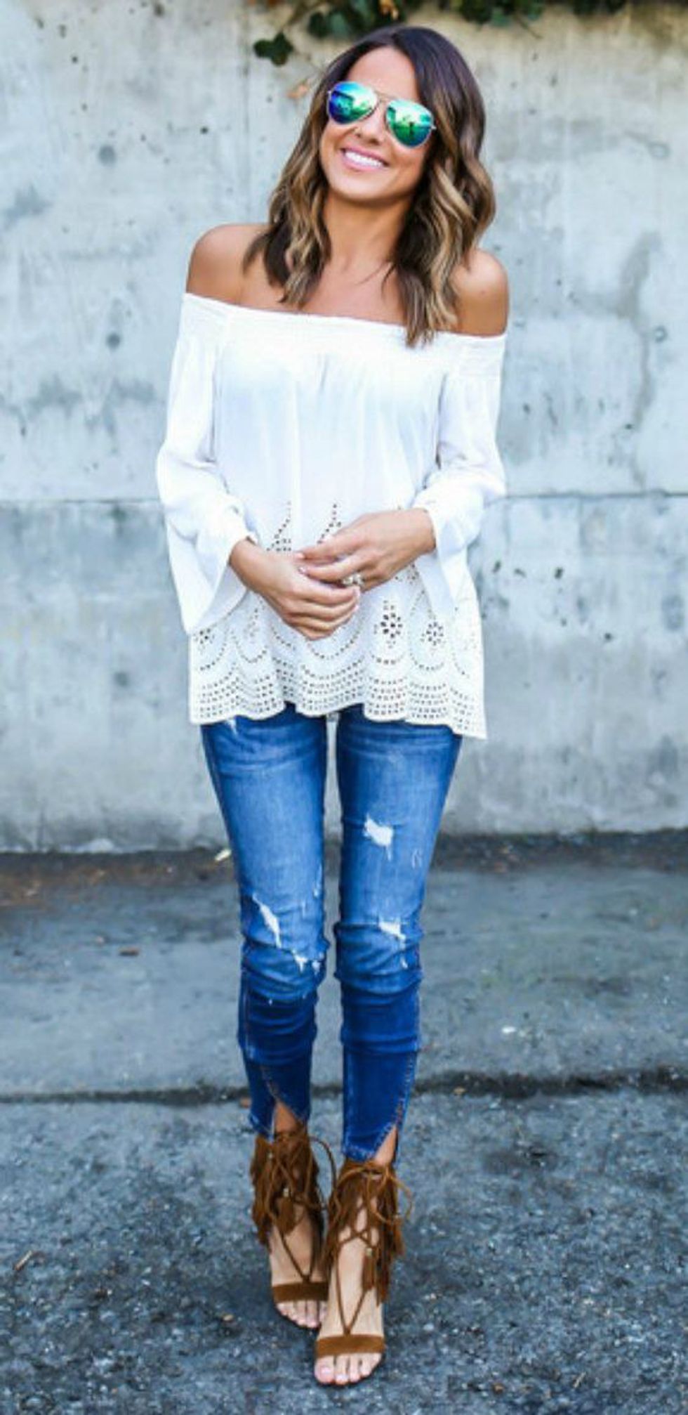 Off the shoulder tops are the most versatile tops; they go with anything. They go with shorts, jeans and skirts. Jeans and skirts give the off the shoulder look a more dressed up look. Pair with a long necklace and a pair of pumps or flats. Shorts give an endless summer look. Pair these with a pair of sandals.