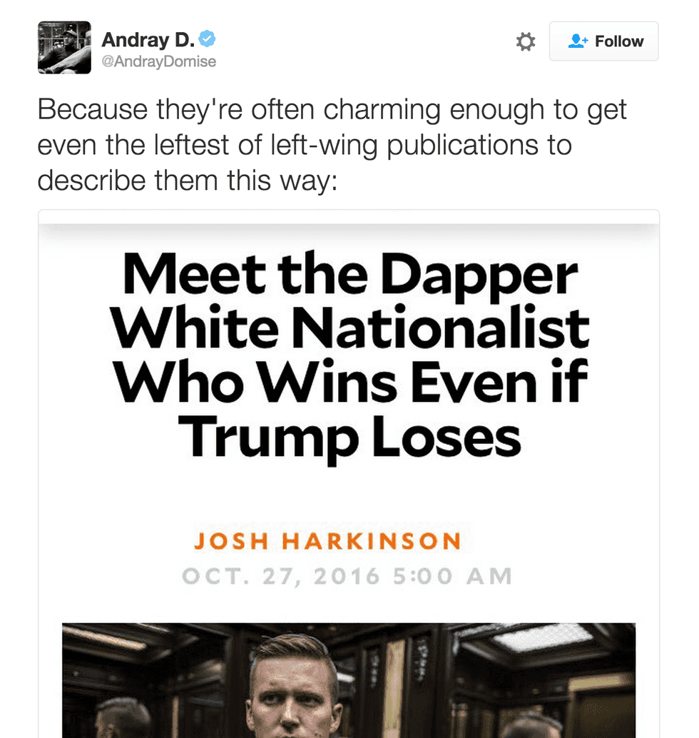 What? Why is this even happening? The Alt-Right? Articles talking about how "dapper" white supremacists are? What is going on? I mean, yeah it’s important to understand that there are people who want to disenfranchise entire groups of people for race and ethnicity and religion but while you’re humanizing people who want other people to die, the people of these marginalized groups aren’t getting the same treatment. They’re not being humanized. Why are we okay with this? I didn’t start out the year 2016 with the thought that Nazis were going to be “in” for the attractive pool. Why are we ending this way?