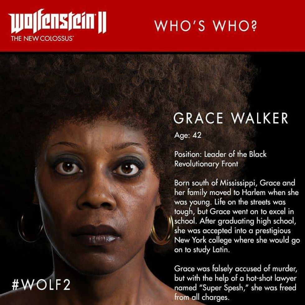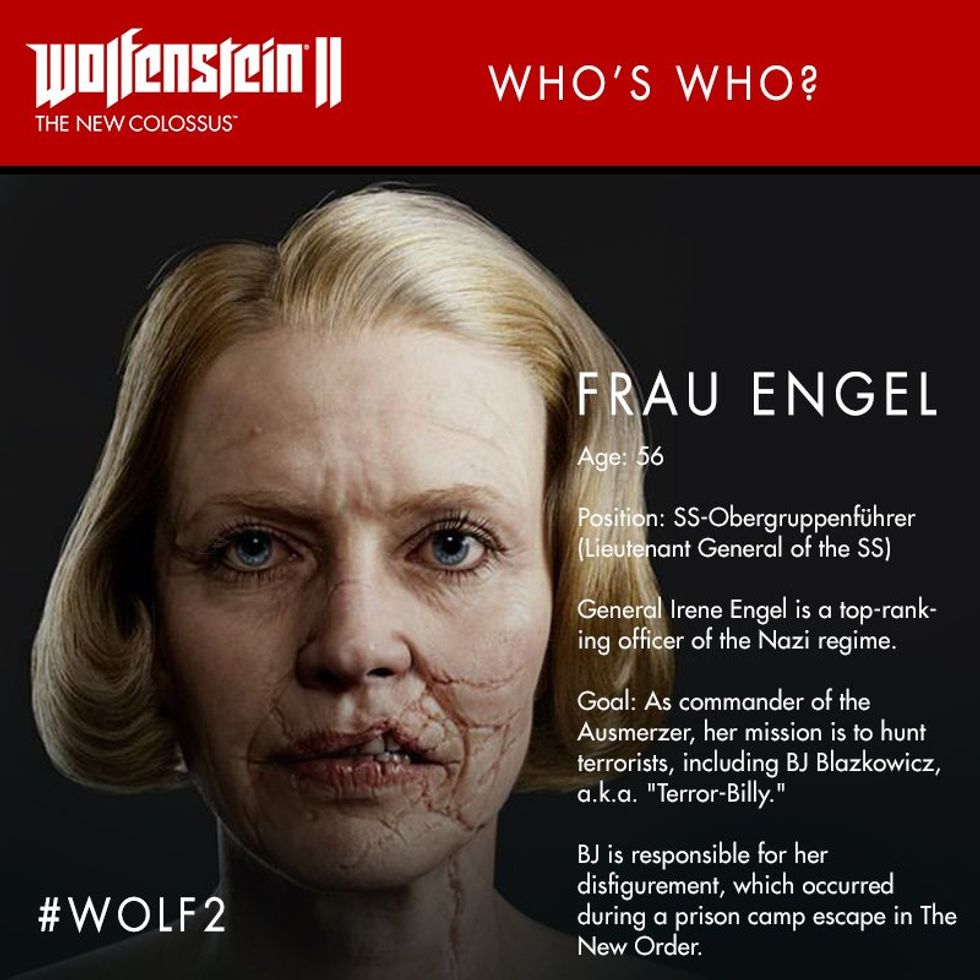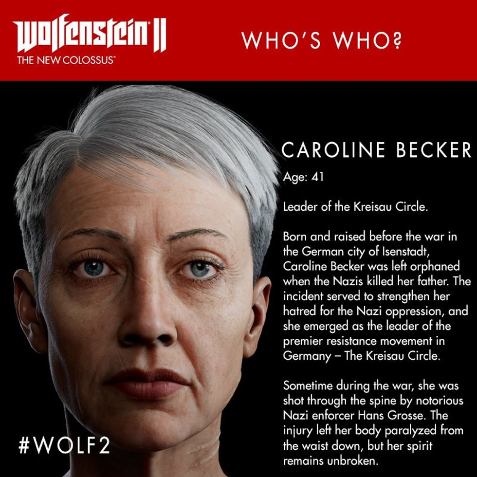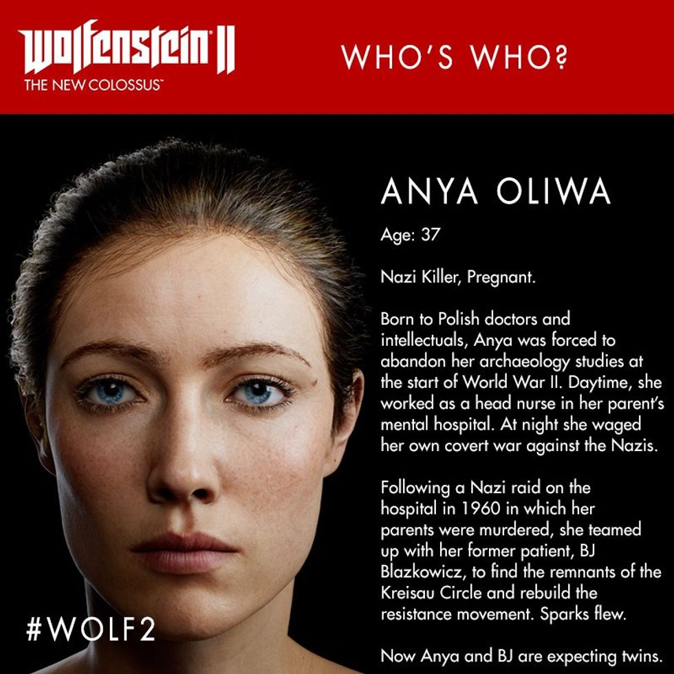 Wolfenstein is about being part of the resistance fighting Nazi's if they won WWII and took over the world. While the main character is a man there are a lot of strong females in this story. Caroline Becker was the leader of the Kreisau Circle, or at the very least the Kreisau Circle of Isenstadt, in Wolfenstein. She would give mission orders to William, the main character and still fought even though she was bound to a wheelchair. Grace Walker is the leader of the American Resistance cell in New York City in the sequel game. She takes over as leader of the Kreisau Circle when Caroline dies and continues to give William his missions. Anya Oliwa was a nurse that helped William when in a coma, helped find and becomes a member of the resistance, and is William's lover and mother of his twin children. Anya is so badass that she is fighting and killing Nazi's while five months pregnant. If that is not badass than I do not know what is. Frau Irene Engel is a female antagonist in the game. She is a extremely loyal Nazi general that hates William and the resistance she calls vermin. These are examples of strong women, while not the main character lead important roles in the game.
