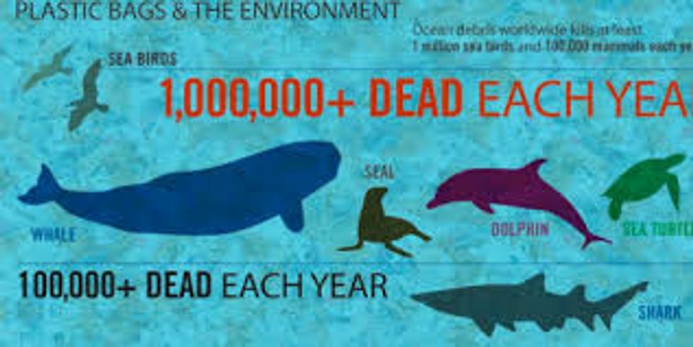 Specifically, sea turtles are at the greatest harm for ingesting plastic bags because their primary source of food is jellyfish. And a floating plastic bag and a jellyfish look pretty similar. Once the sea turtle eats that bag, obviously the plastic does not digest and gives the turtle a false sense of satiation so that they think they're full and stop eating.