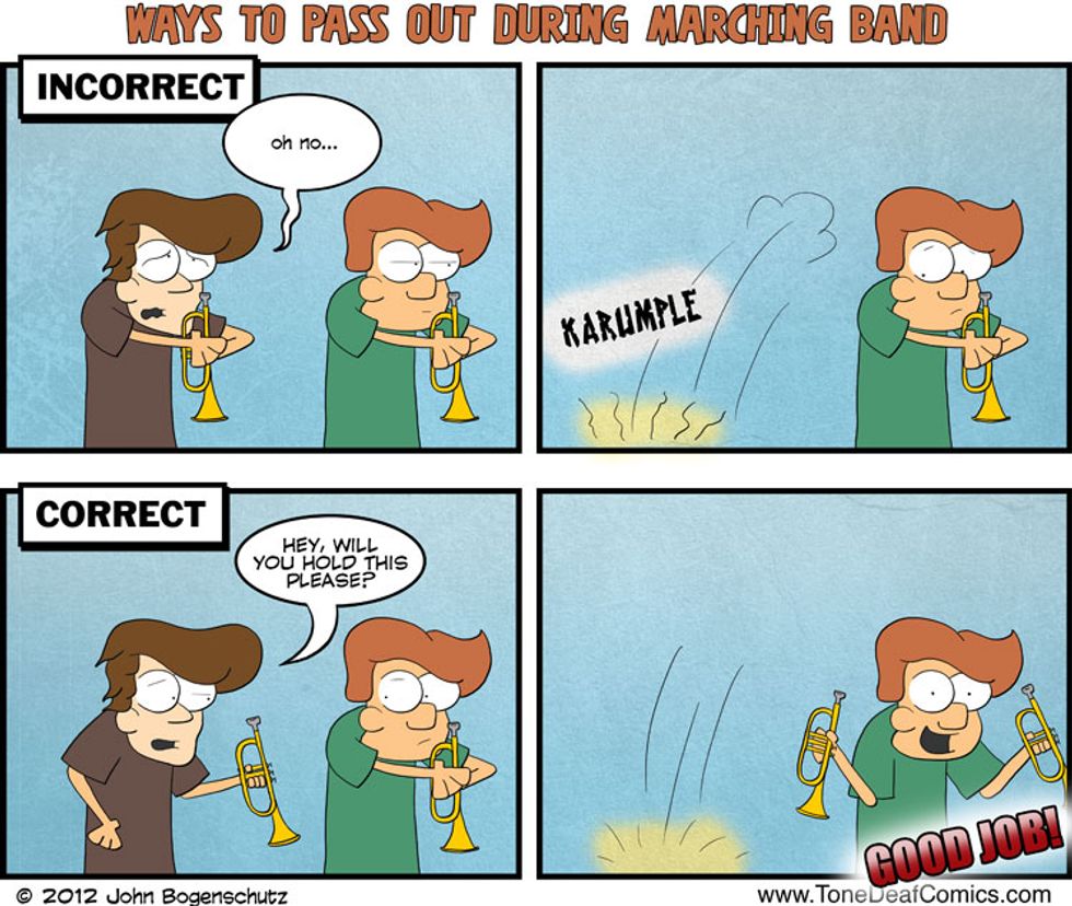 - Knowing that you can't be as good as drum corps because you have people who pass out after running the show once.