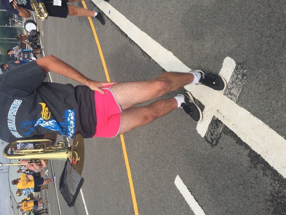A lot of people march in athletic shorts. Sometimes when you don't do laundry and have to borrow your girlfriend's shorts, you can end up with blindingly pale thighs shown off to the whole band.