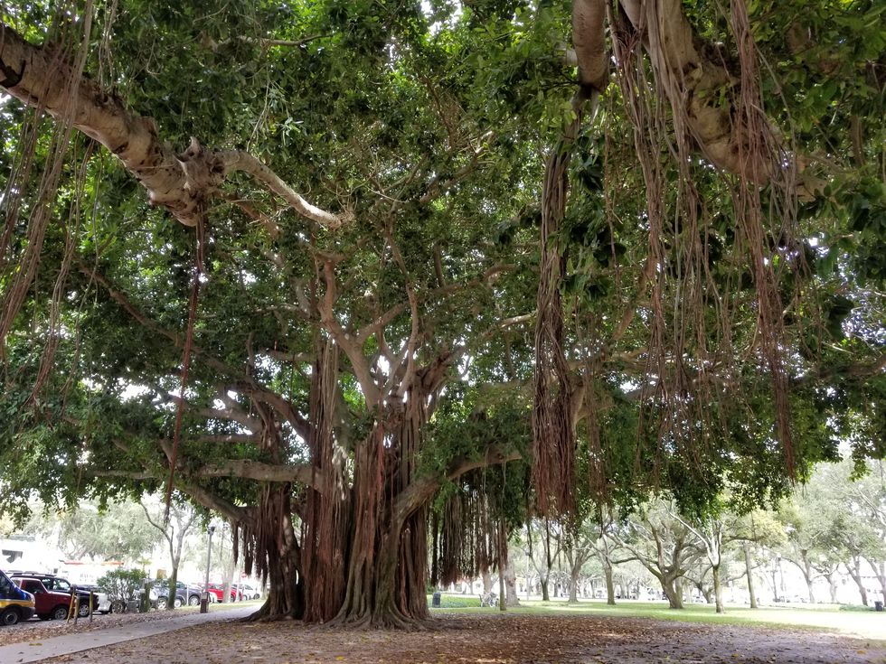 In a park in downtown St. Petersburg, FL, were two trees from another world, trees that belonged in the jungles of India with monkeys swinging from their branches. My husband and I who had been passing the time as we waited to see a movie downtown, approached the sight with a sort of reverence.