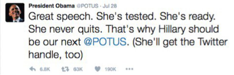 Since the creation of the account on May 18, 2015, we have seen President Obama discuss the most important of subjects. He stands in what he believes in, states it professionally and it warms our heart. I could not imagine this account being controlled by @therealdonaldtrump.