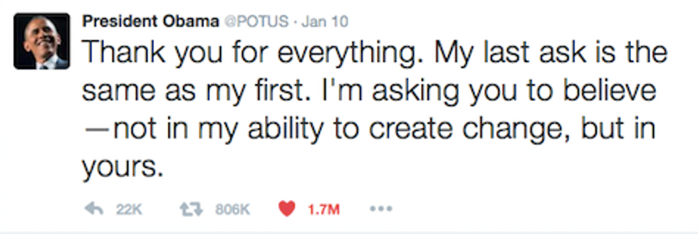 Thank you, President Obama, for serving this already great country with an amazing 8 years. Here is to one more week of being our president and to one more week of having a president who can tweet.