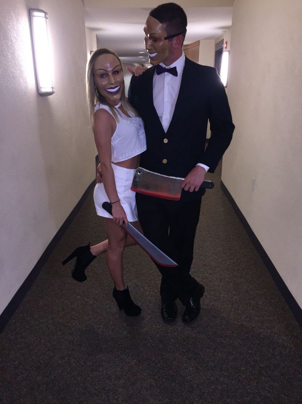 This is actually my least favorite costume because I hate masks. I want people to see my face and be able to find my friends easily without them having a mask on. So basically, to dress like someone from the movie The Purge, you can take one of two approaches. If you're a girl, you're most likely going to wear some lingerie and a robe, throw some blood on yourself, grab a mask, and maybe a knife or some other sort of weapon. Guys or girls can take the second approach: dress in a white button up or blazer or something that makes you look successful and just like the first approach, grab a mask, maybe some blood, and a weapon.