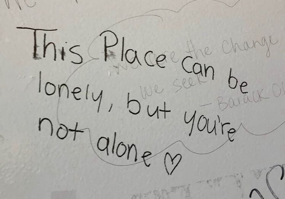 Some things don’t change when you get to college. Some spaces will always remain sacred. As freshman year began and students herded into classrooms I didn’t know how to get to, I found solace once again in the bathroom stalls. Stepping into one minutes before my first exam in December, I noticed the words written on the wall reading, “This place can be lonely, but you’re not alone.”