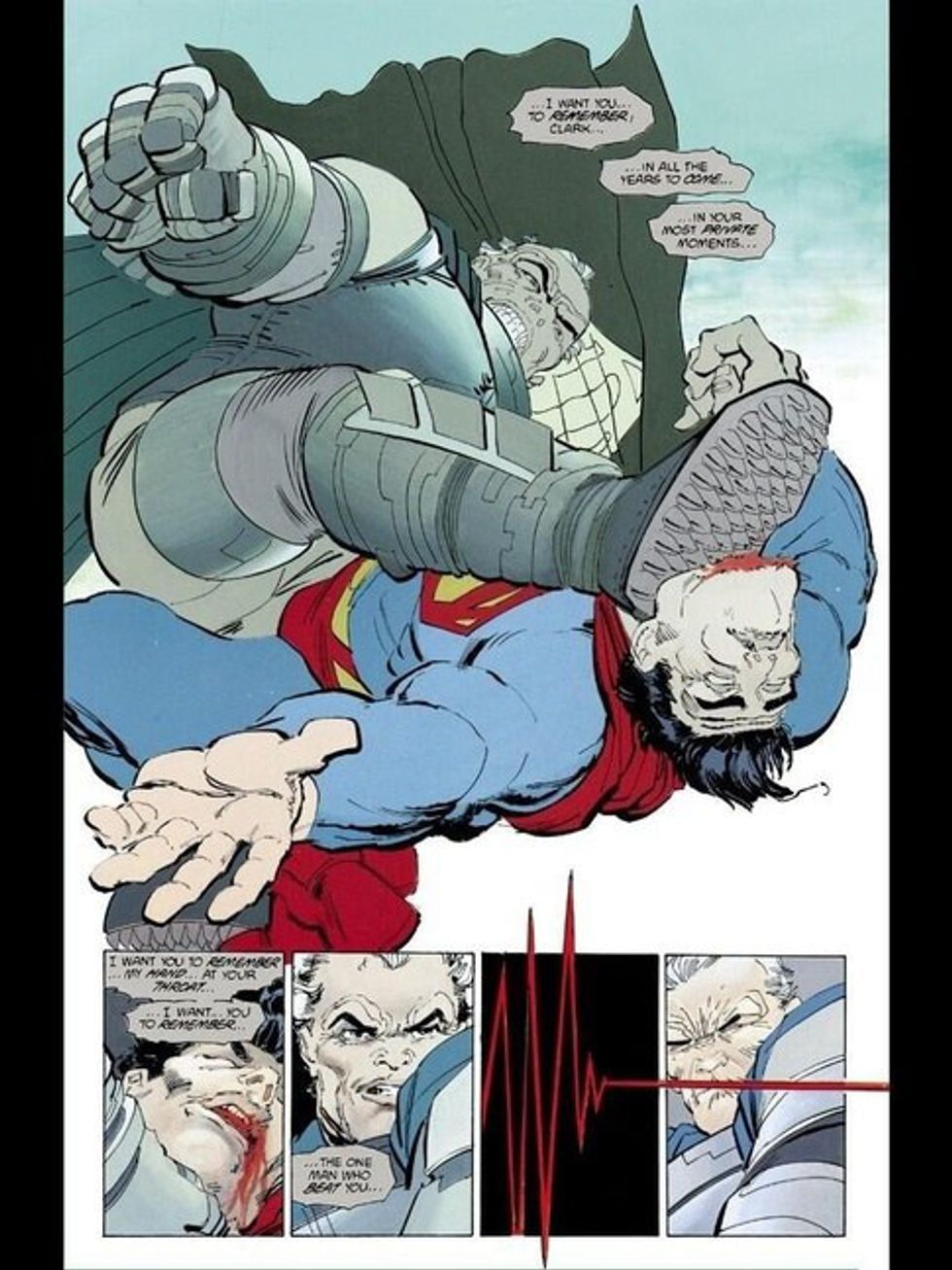 For the first time, we are seeing an old man, Bruce if you will. This Batman is based off the hailed "Dark Knight Returns" story arc in which Bruce Wayne is forced out of retirement to take on the crime in Gotham once more. In this story arc, the U.S. president (clearly Richard Nixon in the comic) employs Superman as his Homeland Security, and tells him to take down the Caped Crusader. In this epic knockdown drag-out, we see the Bat-armor from the very first teasers of the movie which was made just in case Superman was to ever go rogue against another member of the Justice League (hence my first point). To make a long story short, Batman does indeed take down the Man of Steel in this brawl.