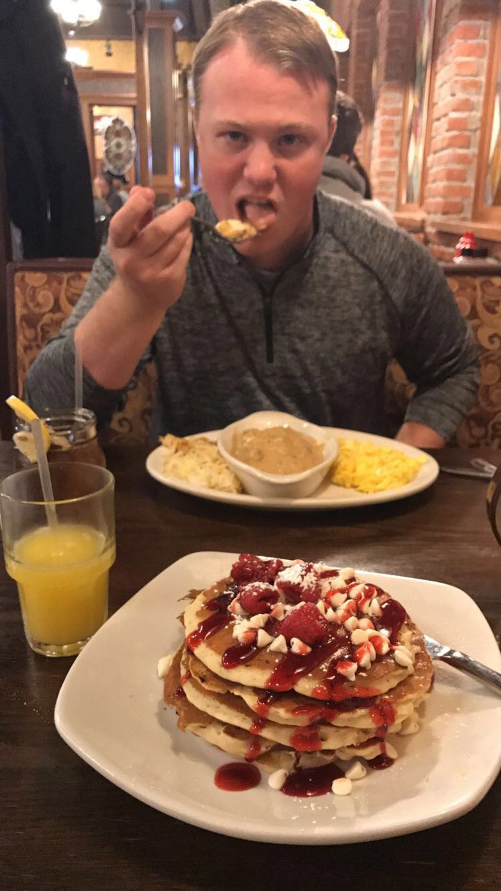 The other day I went out for brunch with my boyfriend (I had been craving pancakes for days). I saw salads and "500 [calorie] and below" options on the menu. I ordered pancakes. Five big pancakes with raspberries baked inside. Five big pancakes adorned with raspberry syrup, white chocolate chips, and powdered sugar.