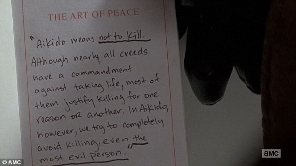 Morgan was not always the peaceful warrior we know him as now, but Morgan's struggles make him all the better model for peace. Morgan has witnessed some of the darkest parts of humanity in his mind. He lost his wife, his son, and his sanity. "CLEAR" was his motto for a while, and he killed everything in his path--walker or human. On the other hand, Morgan has also witnessed some of the kindest parts of humanity. During his upheaval, Morgan met a guy named Eastman who gave him "The Art of Peace" book.