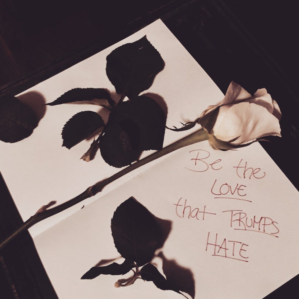 The slogan is an expansion of the already famous "LoveTrumps Hate". It is "Be the Love that Trumps Hate". I am using a white rose as my symbol for this and will be passing them out to reflect my love for this nation and all who live in it! Please help me to spread the word across, by doing the same and passing out anything you find to be beautiful and pure, and incorporate the slogan to it in some way as well. I believe we, as a nation, can stand strong without spreading hate and more negativity, but by being good and showing our love through simple gestures like this movement!
