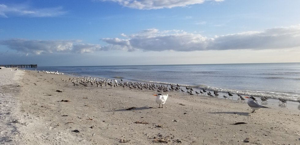 Puffy clouds line the horizon where the sun is headed. It shines brightly just above them illuminating the water with a trail of light. I can't help but think; I belong here. A fling of sandpipers zip past, diving and circling in rapid syncopated motion. When facing one way they are nearly invisible, their dark browns blend in with water and sky, but when as a group they turn, all their white feathers catch the sunlight at once in a brilliant flash of light. Their angled wings are perfect for maneuvering fast, confusing anything that would try to catch them.