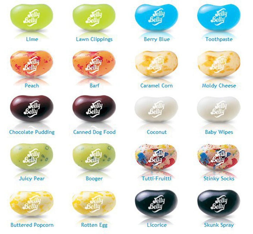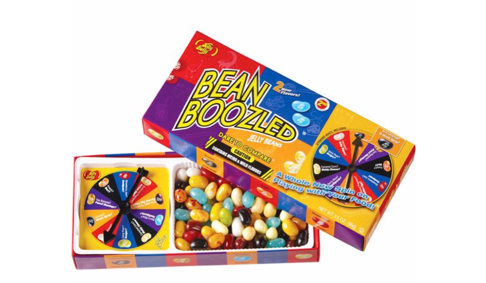 The Bean Boozled challenge features pairs of Jelly Belly jelly beans that look exactly alike but couldn't be more different. You've probably seen countless videos of this on YouTube. If not, click here to watch. Each of the ten colors has a good and a bad flavor, as follows. You can buy Bean Boozled online from Jelly Belly.