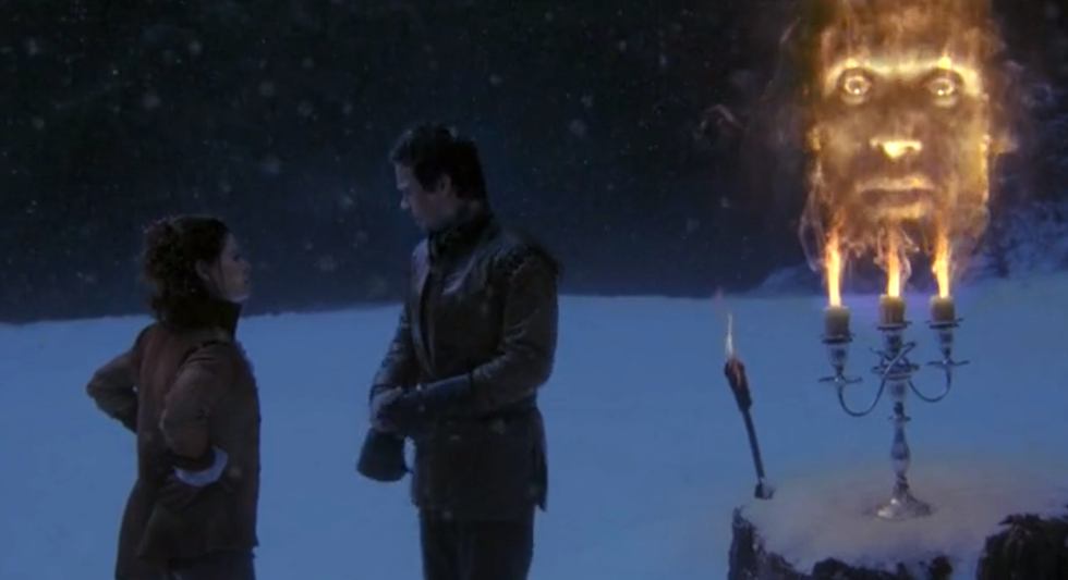 Lumière (Henri Lubatti) with Belle (Emilie de Ravin) and her now deceased son-in-law Neal/Baelfire (Michael Raymond-James) in "Once Upon a Time"