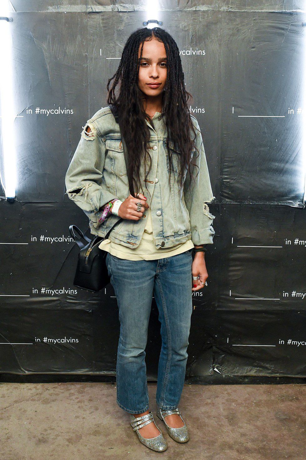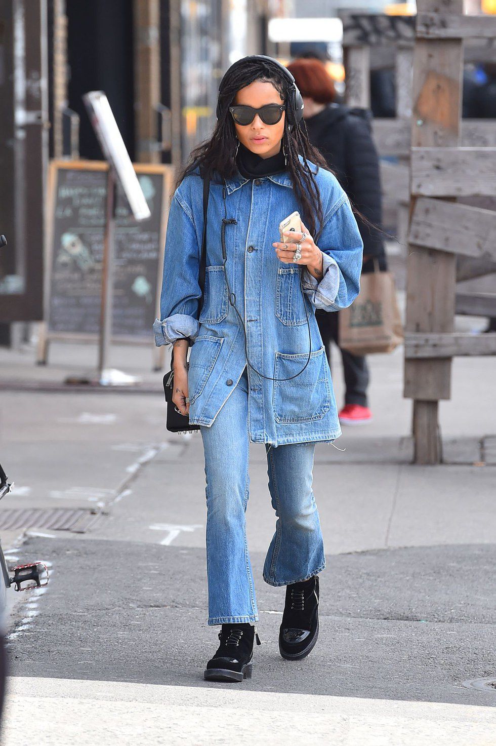 Here, we see Kravitz once again with denim on denim. however this time she took a risk and wore two different tones of denim. I am absolutely in love with her distressed light wash denim jacket. She paired the look with medium wash boot cut jeans and a really cool pair of silver ballerina flats.