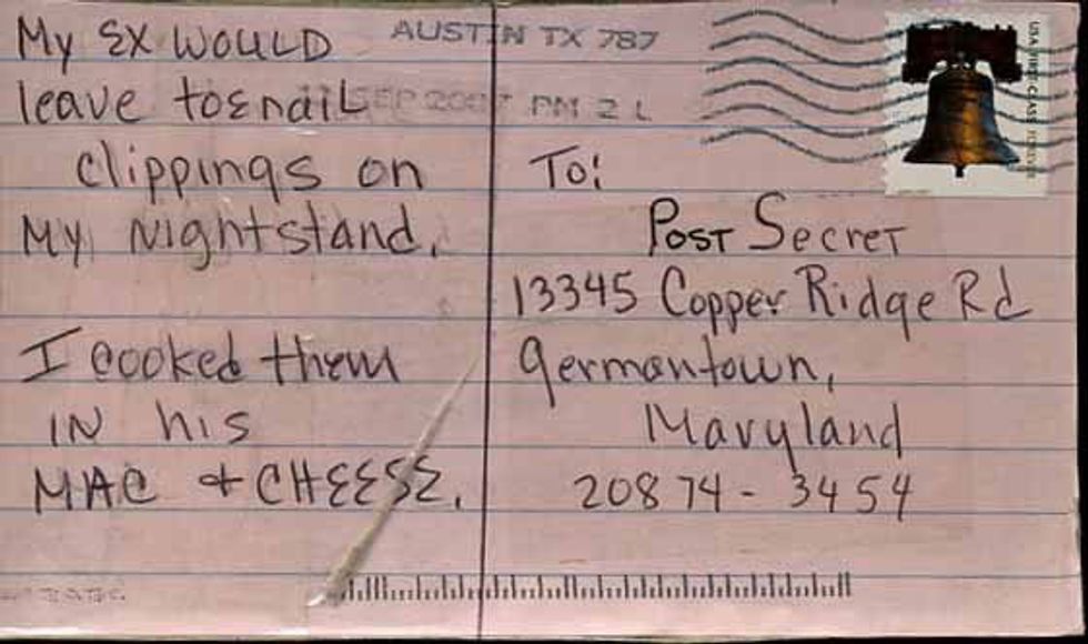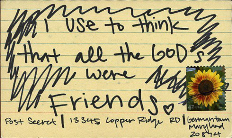 Several years ago, I discovered PostSecret, and I have been a devoted follower ever since. For those of you who have not heard of PostSecret, the concept is simple: people mail postcards to a man named Frank Warren. These postcards contain sometimes objects, sometimes art, but always secrets. There are very few guidelines for these postcards; the most important guideline is that the secret can never have been told to anyone before.