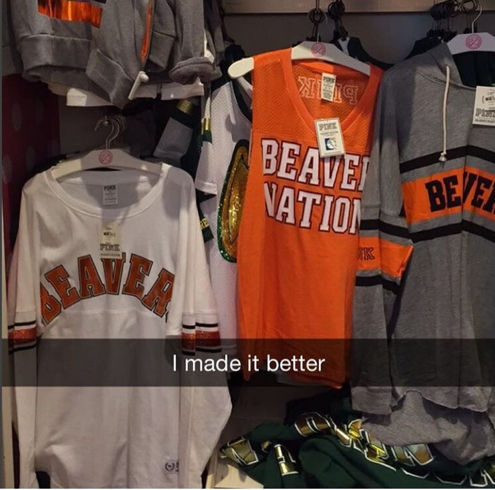 "This whole display for that other school? And the OSU stuff was just on a rack? So I fixed that for them #yourarewelcome #gobeavs." Katie Hughes