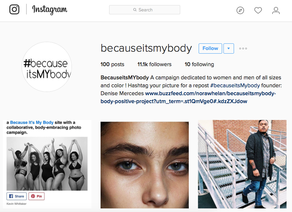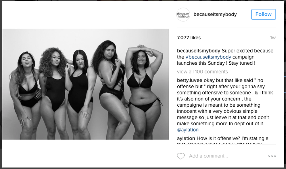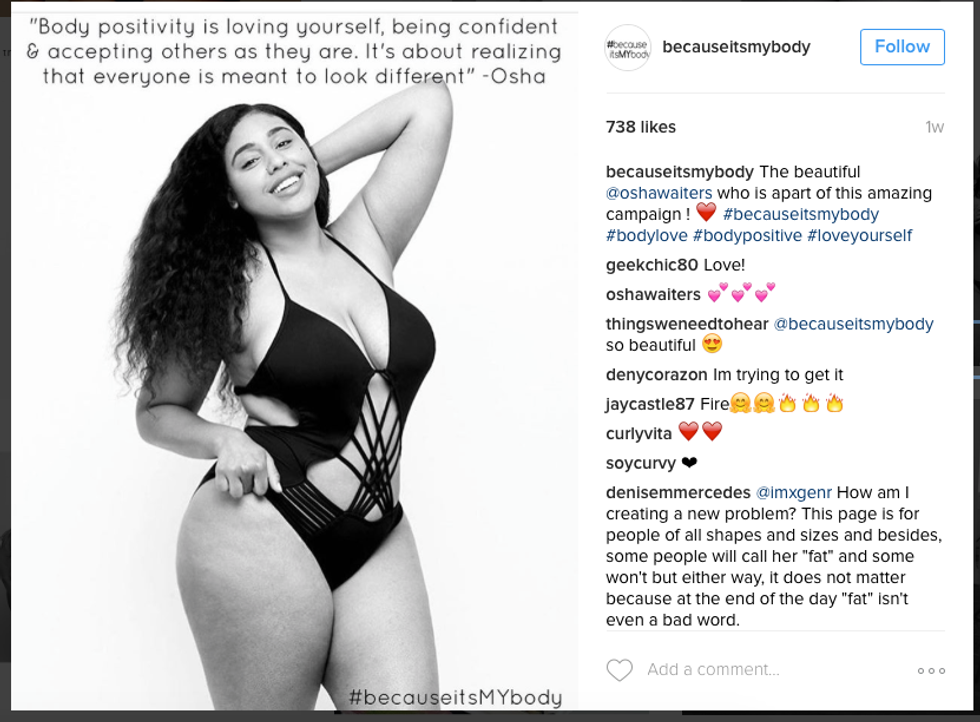 Denise Mercedes a blogger and model started a campaign to promote self-confidence and body love. It started out with just a hashtag, #BecauseItsMYBody. Plus size models, bloggers and a lot of others answered the campaign by posting pictures of their body with that hashtag. Mercedes would then take these pictures and post them to the Instagram account @becauseitsmybody.
