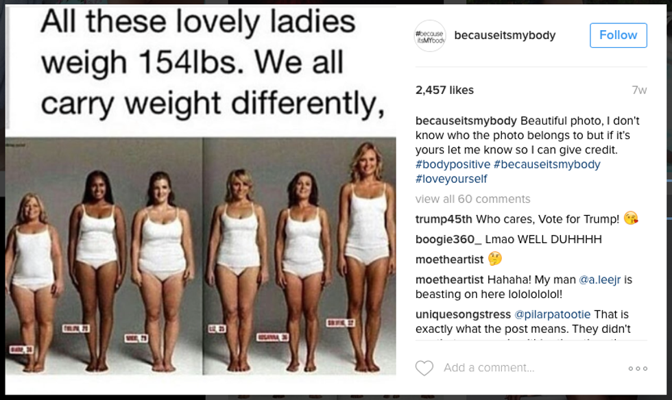 A lot of people may see these posts of people on social media and think it is a feminist movement. I can see why some may think that because it is many pictures of women, but the Instagram account is open for everyone. In the description of the Instagram account it says "BecauseitsMyBody A campaign dedicated to women and men of all sizes and color!" On the Instagram account you will see that more men are starting to use the hashtag. Mercedes told BuzzFeed "When I started the Instagram campaign, it was women who were using the hashtag, but I made sure to specify that anybody can use the tag and be featured - men, women, tall, short, skinny, plus-size, LGBT, etc."