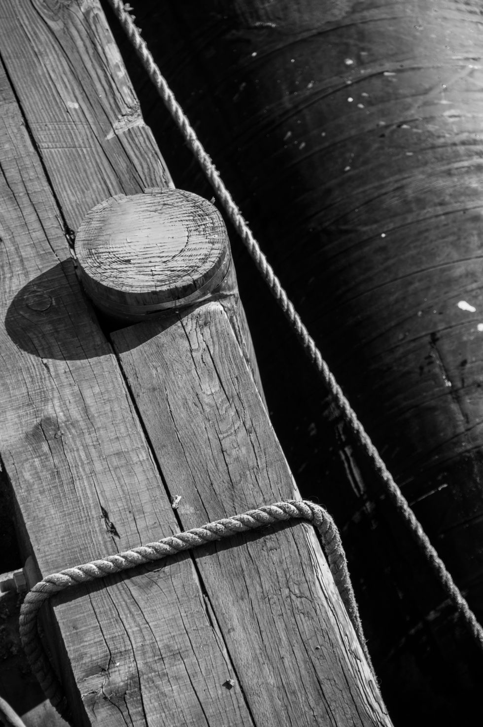 This photograph was actually slightly overexposed, but by using B&W, extremes can be used effectively to balance it out. The texture of the wood grain and rope are much easier to see and don't look out of place because there isn't any color to distract from their roughness.