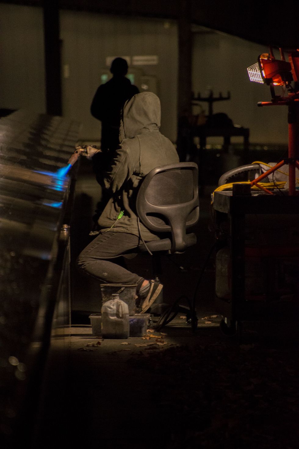 In this photograph, the worker is isolated from the foreground and background by light and darkness. Although this picture was taken at night, I lowered the shutter speed to 1/60th of a second (Normally I like to keep it at 1/80th at the lowest), so the ISO could remain relatively high. This means that, despite a slight grain in the background, the worker and his immediate surroundings are still sharp.
