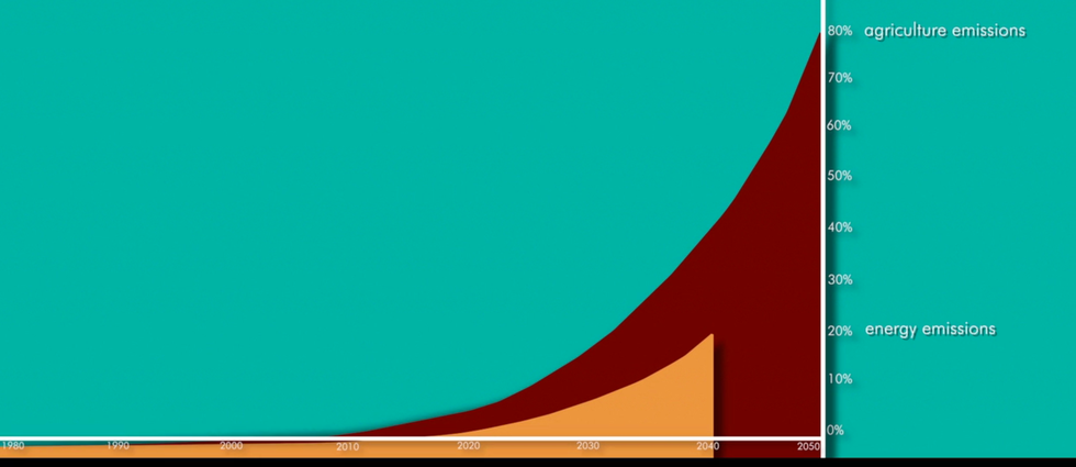 According to the United Nations Food and Agriculture Organization’s official Henning Steinfield, “Livestock are one of the most significant contributors to today’s most serious environmental problems”. This includes but is not limited to: water and land degradation, oceanic dead zones, habitat destruction, species extinction, 1/3 of fresh water consumption, and more importantly 91% (pg. 9) of Amazon destruction. Agro-Business in itself emits 51% of all worldwide GHGs with just its carbon emissions alone. An even scarier factoid is that it emits even more Nitrous Oxide—which is much worse for the environment. The UN News Centre article later states that Agriculture generates 65% of human-related nitrous oxide, which has 296 times the Global Warming Potential (GWP) of CO2. As if that was not scary enough, with prosperity increasing globally, global meat production is expected to more than double by 2050! I have been throwing a lot of numbers at you so let me show you the severity of this situation visually. The following image is the representation of agriculture emissions in accordance with the global meat production prediction by 2050.